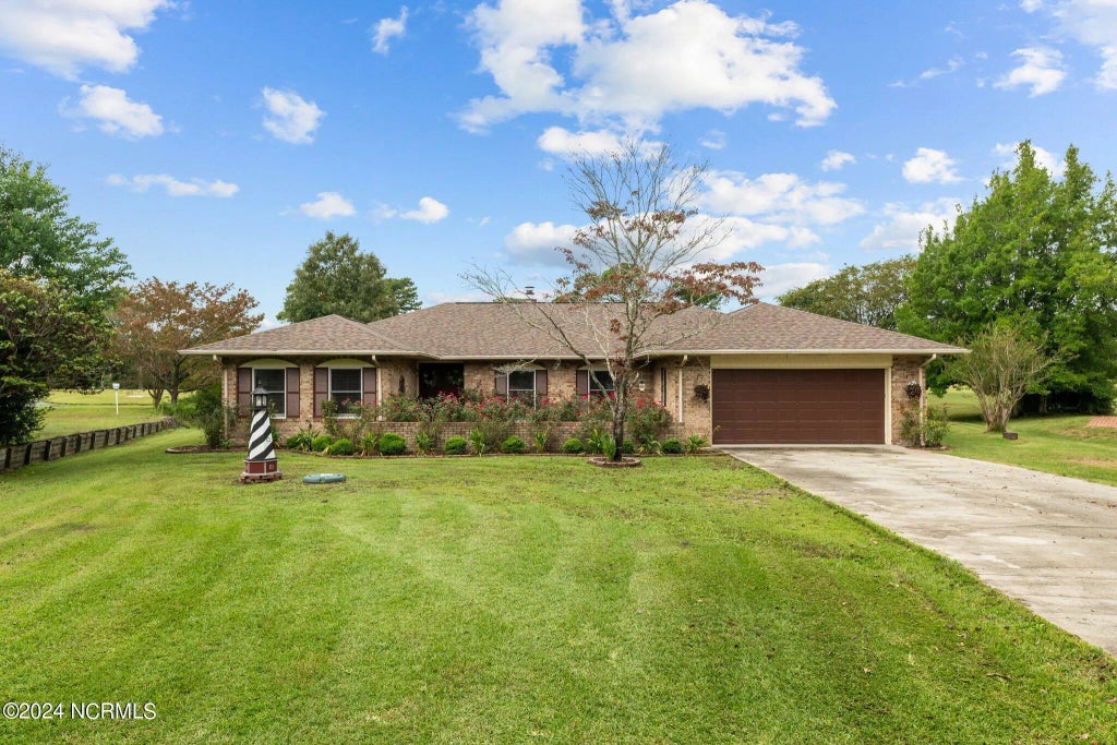 Welcome to this stunning 3-bedroom, 2.5-bathroom brick ranch located in the desirable Fairfield Harbour neighborhood. This home is surrounded by mature landscaping and offers a formal dining room conveniently located near the entrance. The open floor plan flows seamlessly into a spacious living room, featuring a cozy fireplace, and into the well-appointed kitchen with a large island, breakfast bar, and stainless-steel appliances. Enjoy the natural light in the bright sunroom just off the living room, which leads out to the covered deck, perfect for relaxing while taking in the serene lake views from the large backyard. The primary bedroom is a tranquil retreat, complete with sliding glass doors to the backyard and an ensuite bathroom featuring dual vanity sinks. Two additional bedrooms and 1.5 bathrooms provide plenty of space for guests. Located just a short drive from Historic Downtown New Bern and Carolina East Medical Center, this home is the perfect blend of comfort and convenience. Don't miss out on this exceptional opportunity! Call us today to schedule your private tour.