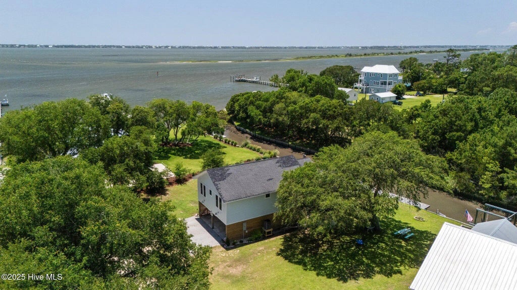 WATERFRONT LIVING WITH COASTAL ELEGANCE & CHARM! Welcome to your serene waterfront retreat where coastal elegance meets laid-back living. Nestled on the canal with deeded water access and sweeping views of the ICW and Bogue Sound, you also get a peaceful private-road setting with a beautifully renovated single-story home offering thoughtfully designed living spaces, with three bedrooms and one full bath. Don't let the one bathroom detour you from this stunning property BECAUSE the current office space can easily be converted BACK to a full bath. That's right, that was its original use! Upon entering, you'll immediately notice exquisite ¾'' tongue & groove beadboard on walls and vaulted ceilings, lending a classic coastal cottage character. The floors are refinished original pine, restoring warmth, patina, and authenticity. The open living / kitchen layout is designed for light, airiness, and entertaining. Large windows frame water views, and the living room flows directly onto a partially wrap-around deck. You'll love cooking in the kitchen while enjoying watching the boats go by. And what a showstopper the kitchen is with the quartz countertops, abundant cabinet storage, and a unique Vetrazzo bar top, crafted from recycled glass, serving as design showpieces. Recessed LED lighting throughout brightens the home, reclaimed wood collar ties accent the exposed ceiling lines. Outdoor living is enhanced by a fire pit, a detached storage shed, and an outdoor shower that is perfect after a day on the water. Water-enthusiast features include a jet ski drive-on port and upgraded LED dock lighting along the canal. And we can't forget about the fur babies. They will love the freedom of an underground fence that allows them to run around and engage in all the family fun activities. With plenty of room to relax, grill, and enjoy all the coast has to offer, this home is not just a property—it's a lifestyle to embrace! Features sheet available. Sold partially furnished.