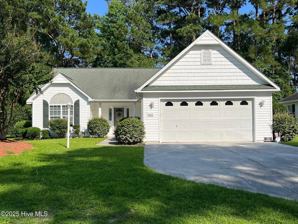 Welcome to this BEAUTIFUL and extremely well cared for 2-bedroom, 2-bathroom, 2 CAR GARAGE condominium in the highly sought-after 55+ community in ''The Villages of Swansboro''. Specifically, the master suite offers a walk-in closet and with private ensuite bathroom. Approaching the home, you are greeted by a covered front porch and outback there is a new slider leading to a 125 sq foot new deck overlooking the forest that has had some brush management so you can enjoy a beautiful and peaceful area to have your morning coffee! Upon entering the home, you will notice engineered wood (an upgrade from LVP that is in a lot of homes) throughout most of the home with tiled floors in the bathrooms. You will also be delighted to see all the recent upgrades that have been thoughtfully designed over the past two years. These include a brand-new kitchen with stainless steel appliances, quartz countertops, waterproof luxury vinyl plank flooring, a 2nd pantry added, soft close cabinets and many pull out shelves. The owner also constructed a laundry room (washer and dryer stay), and to his knowledge is the only home in this neighborhood that has an individual room for laundry versus the washer and dryer being stackable in a small closet, next to each other in a closet or in the garage. Other huge cost savings improvements in 2024 include a new HVAC condenser, air handler & thermostat, generator outlet, new garage door opener system, top-down bottom-up shades, barn door to the Master Bath & upgraded Master bath shower door, new bathroom vanity and wall cabinet in the 2nd bathroom, water heater with a recirculation pump for instant hot water! If this is not enough, the owner has also tinted the windows throughout the house for increased privacy, reduces the glare and heat from the sun, and improves energy efficiency. The HOA takes care of yard maintenance, leaving you more time to enjoy the fun things you want to do in your retirement years.