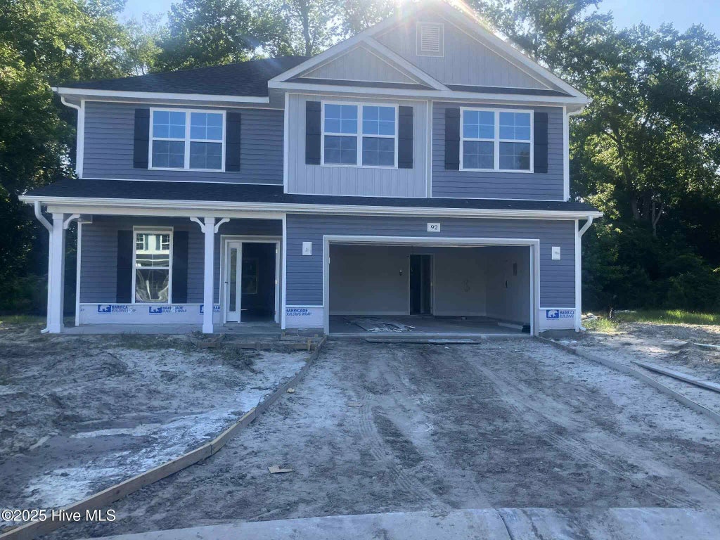 Welcome to 92 Fishing Creek Drive, a newly constructed 2,307 sq ft home in the sought-after Belle Oaks neighborhood of New Bern. This stylish two-story home offers all bedrooms upstairs for added privacy, while the main floor features a formal dining room, a bright breakfast nook, and a spacious living area with an electric fireplace. The modern kitchen is equipped with sleek stainless steel appliances, perfect for everyday cooking and entertaining. Nestled on a quiet cul-de-sac lot, this home combines quality craftsmanship with peaceful surroundings