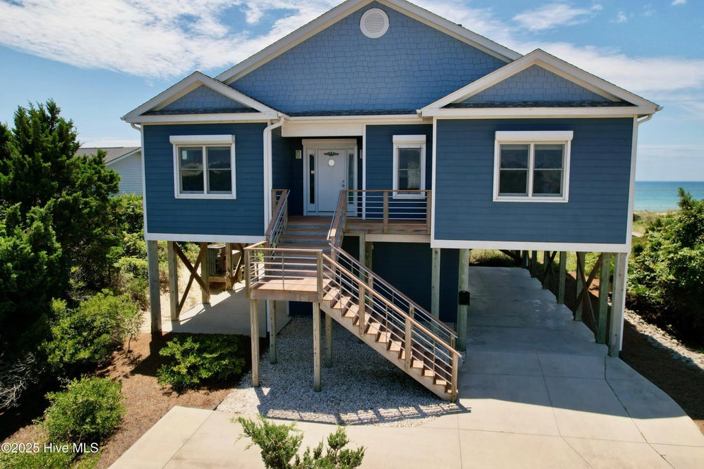 This home offers a rare combination of ocean and sound-side views, perfectly positioned second row from both the Atlantic Ocean and Bogue Sound. This well-built 3-bedroom, 2-bath home features hardwood floors throughout, a spacious open layout, and a large deck ideal for taking in the ocean vistas. The kitchen is equipped with a gas cooking range, and the primary bath includes a steamer shower for a spa-like experience. An elevator provides easy access to all levels, and hurricane shutters offer peace of mind. Additional highlights include covered parking, an outdoor shower, and tasteful furnishings that convey with the property, making it move-in or rental-ready.