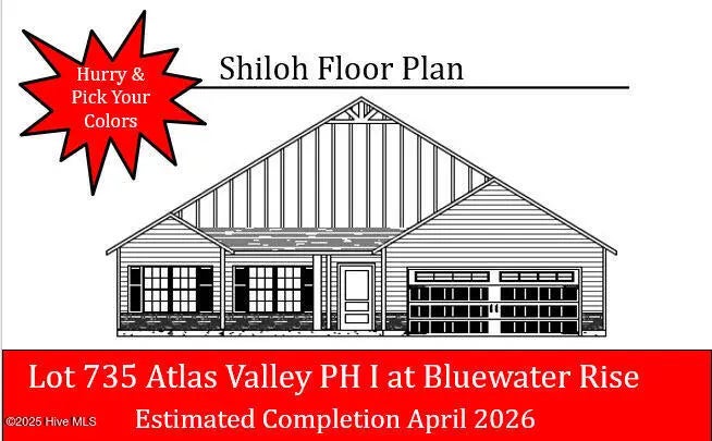 The ''Shiloh'' floor plan is under construction in the new Atlas Valley Phase of Bluewater Rise. Contract early & make design center selections. Builder offering $10,000 buyers closing cost assistance w/ use of preferred lender and closing attorney. Features include granite counter-tops, stainless appliances, oversize patio for entertaining and trey ceilings in the master suite with his & hers closets! Creekside school district! Minutes from downtown New Bern & Cherry Point MCAS.