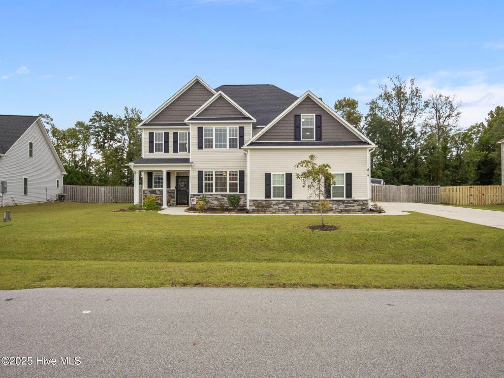 Welcome to this stunning 5-bedroom, 4.5-bathroom home in the desirable Onslow Bay community of Jacksonville, NC. With over 3,400 square feet of living space, this home offers room for everyone and thoughtful upgrades throughout. Step inside to find luxury vinyl plank flooring extended throughout the first floor, creating a seamless and modern look. The open-concept kitchen and living area are perfect for entertaining. Along with a formal dining room, the breakfast nook in the kitchen provides additional dining space. The kitchen has beautiful granite countertops and stainless steal appliances. The spacious floor plan features two massive primary suites—one conveniently located downstairs and another upstairs—each offering a private retreat with generous closet space and en-suite bathrooms. Upstairs there are 3 additional spare bedrooms- two that share a Jack and Jill bathroom. Recent upgrades include cabinetry added in the laundry room, blinds added to all windows, an extended driveway and back patio. Outside, enjoy the screened-in back patio overlooking a fully fenced backyard complete with a 12x12 shed for extra storage. Built just 4 years ago, this home combines the benefits of new construction with the comfort of added upgrades—ready for you to move in and make it your own.