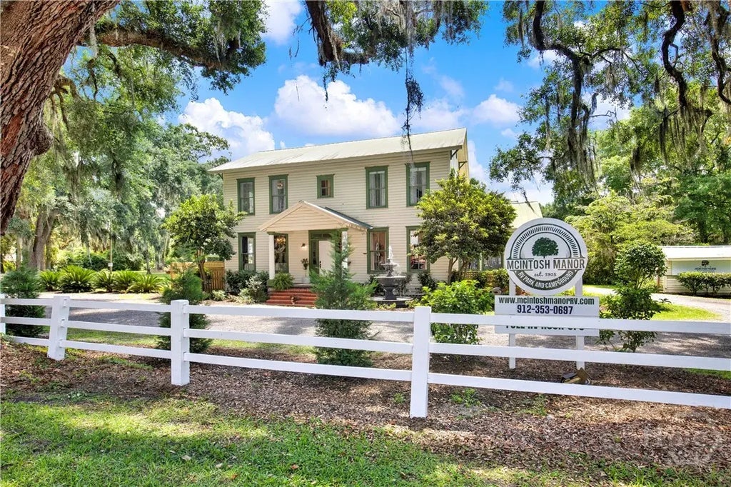 This 13± acre income-producing RV park in McIntosh County, GA offers an exceptional investment opportunity with expansion potential. Just 1.1 miles from I-95, the property is zoned PUD, allowing up to 195 RV slips. Currently operating with 18 full hook-up sites, the park features app-based and coin-operated laundry, a 24'x30' metal storage building, and a massive artesian well serving the entire property. On-site lodging includes three income-producing units: a beautifully restored 5BR/6BA historic home (McIntosh Manor), a private Cypress Log Cabin, and a fifth-wheel RV. Towering live oaks and a historic carriage house add charm and future event potential. Completed site plans for expansion and integrated automation systems make this a turnkey opportunity for a boutique RV resort, short-term rental retreat, or unique event venue. Located directly off Historic Hwy 17 and minutes from Darien, Brunswick, Savannah, and the Golden Isles.